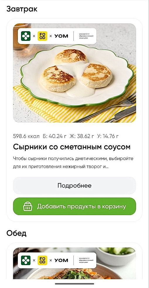 После заполнения анкеты пользователи получают готовый сбалансированный план питания, который разбит по дням и приёмам пищи, а также детализирован по показателям КБЖУ.